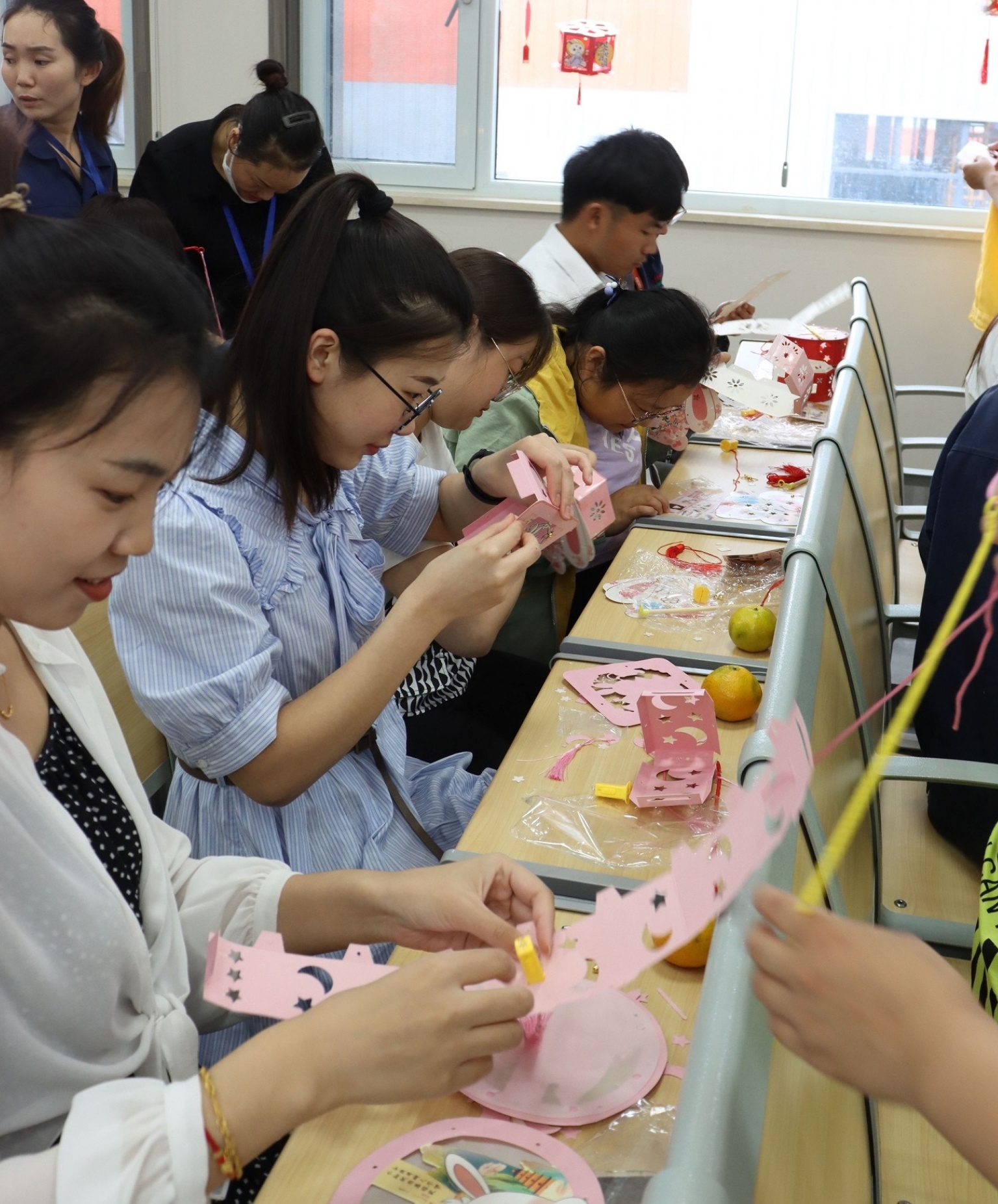 DIY手作區(qū)還特別準備了花燈的制作,粘貼、栓繩、放燈,精美可愛的小花燈像一盞盞“小月亮”,映照著眾人的笑臉。