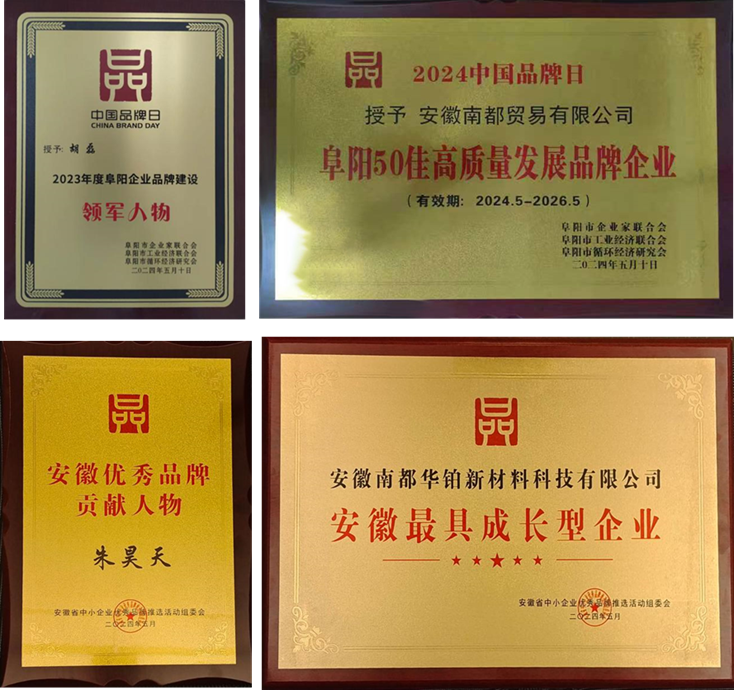 安徽南都憑借卓越的品牌實力和市場競爭力榮膺“阜陽50佳高質(zhì)量發(fā)展品牌企業(yè)”;安徽南都副總裁、華鉑科技總經(jīng)理胡磊榮獲“2023年度阜陽企業(yè)品牌建設(shè)領(lǐng)軍人物”稱號;子公司華鉑新材料榮獲“安徽最具成長型企業(yè)”;安徽南都副總裁、華鉑新材料總經(jīng)理朱昊天榮獲“安徽優(yōu)秀品牌貢獻(xiàn)人物”稱號。